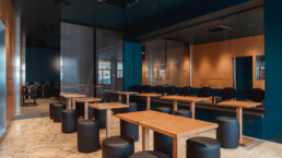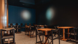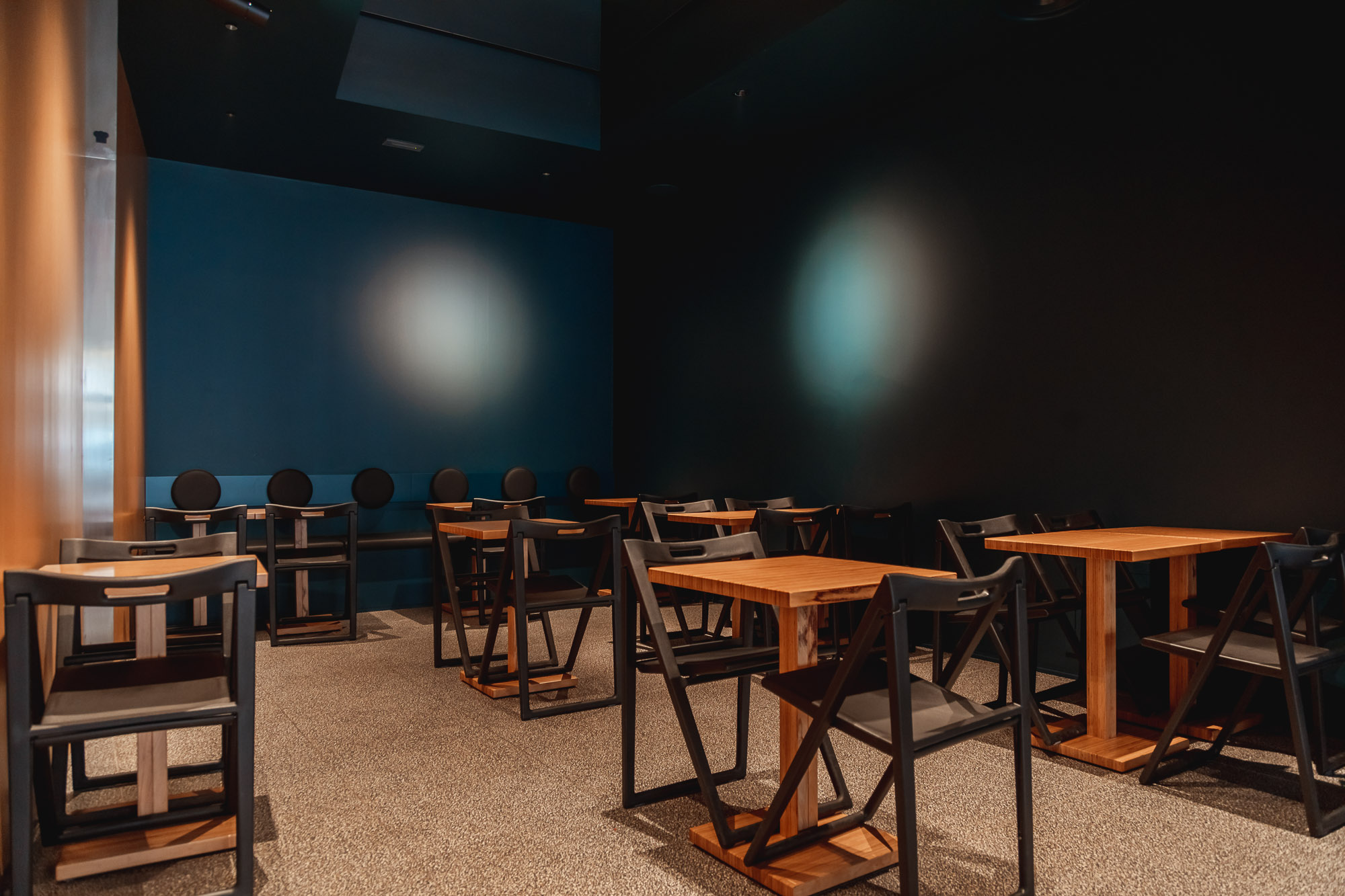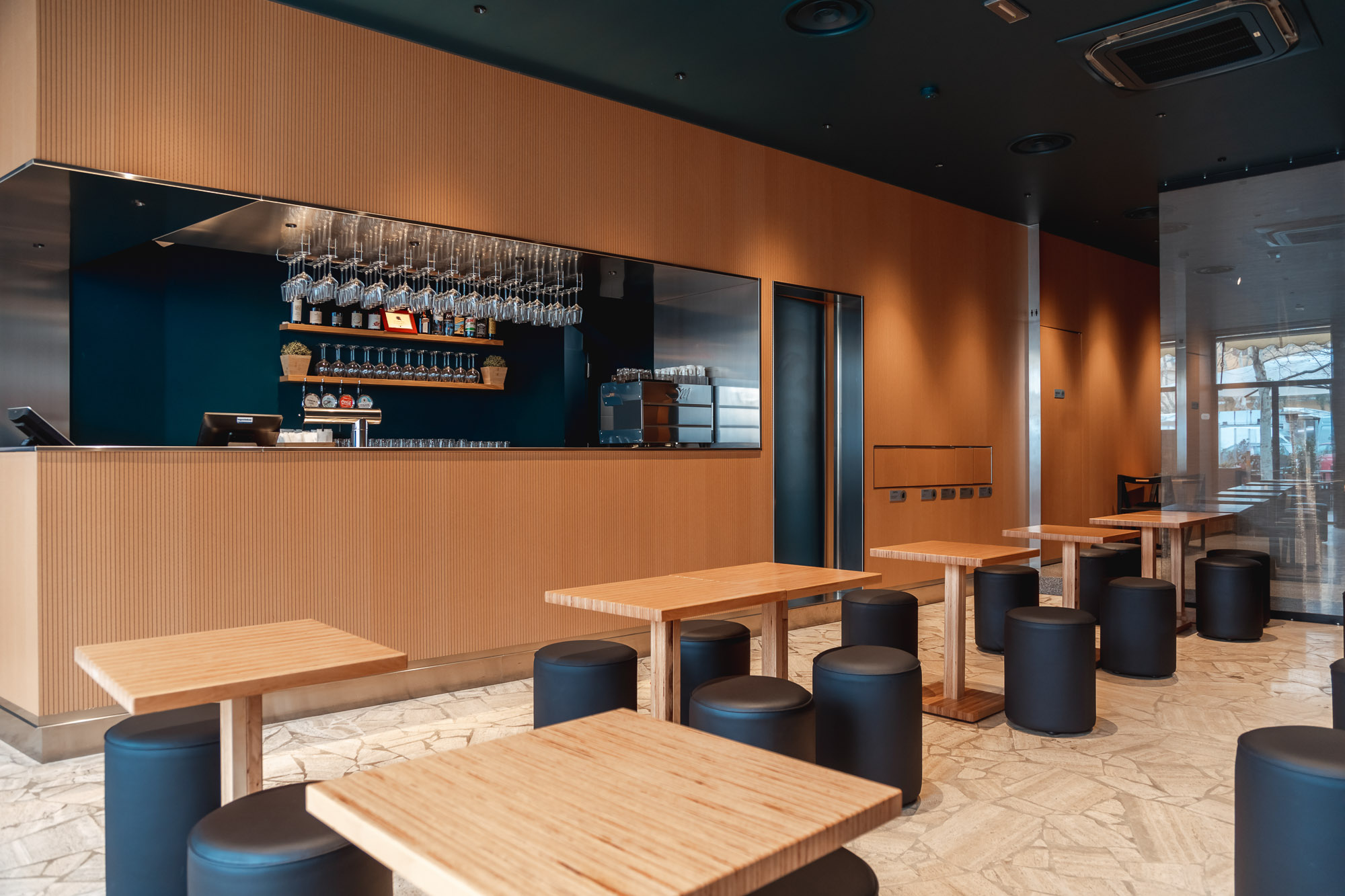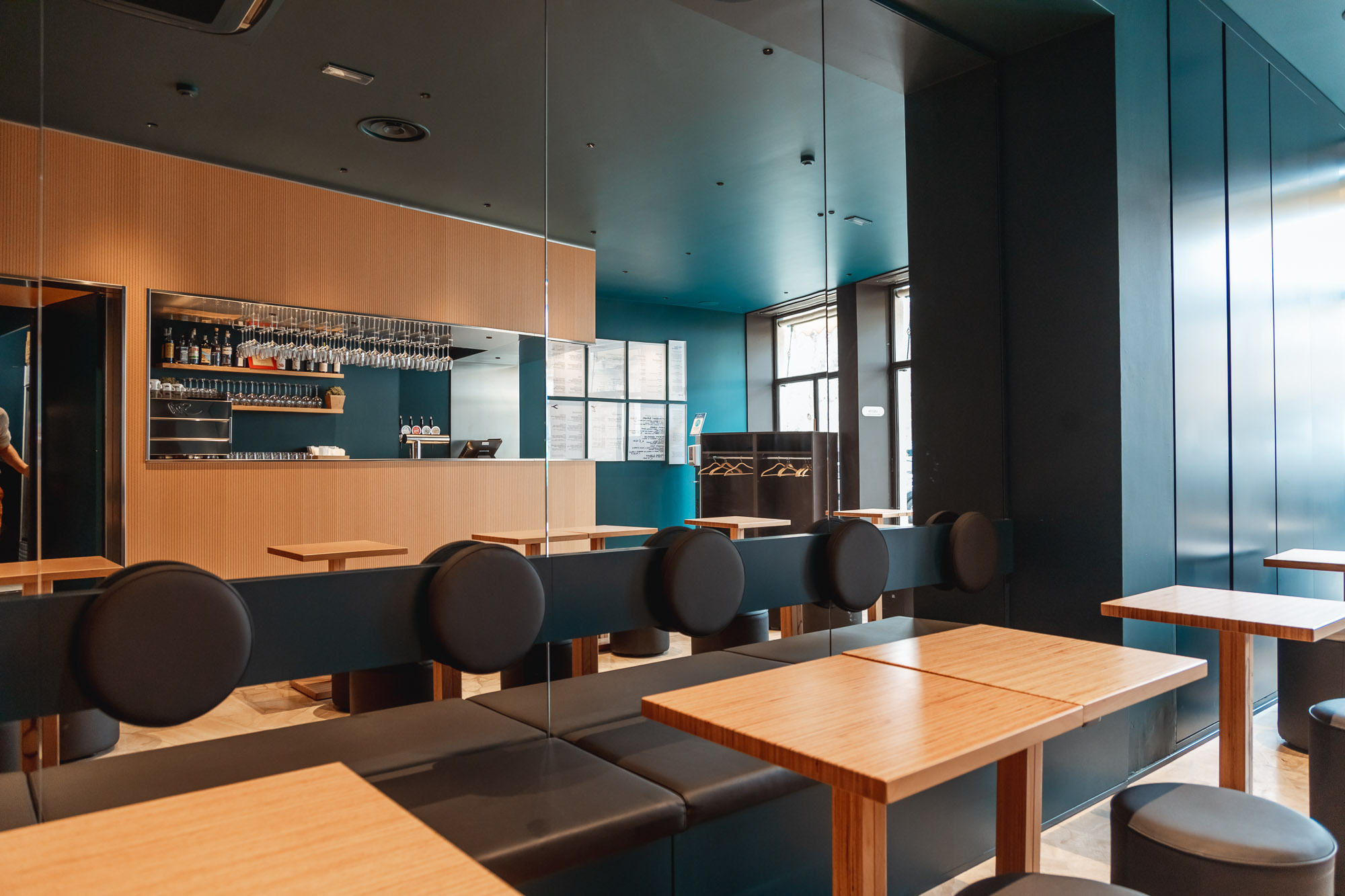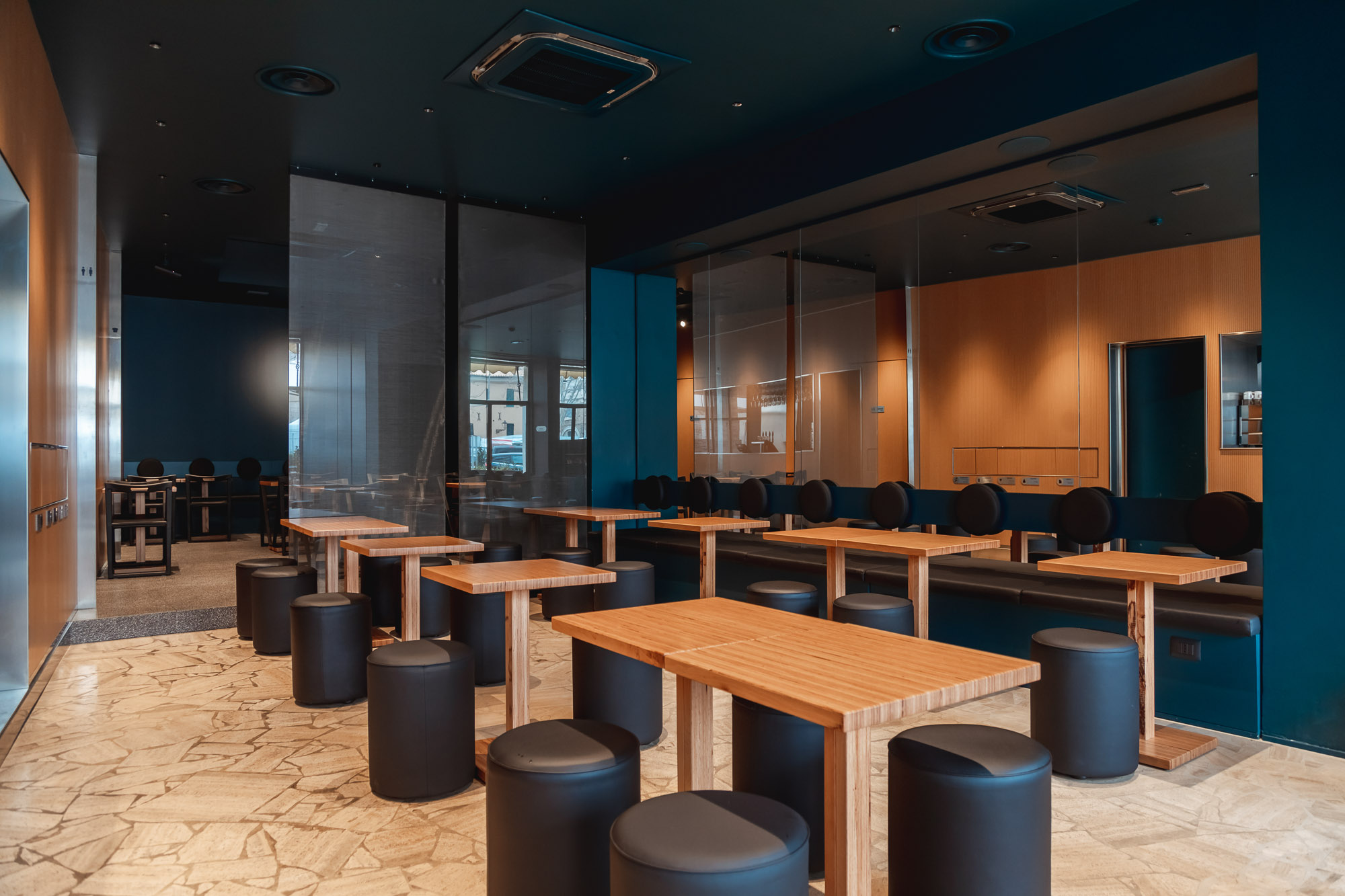 Alle pareti non troverete decori. Sarà lo spazio a definire la vostra esperienza, con pareti specchianti che dilatano l’ambiente, luci e cavi, in un susseguirsi di spazi autonomi ma fluidi, tenuti assieme dalla parete di legno bacchettato, la quale cela le minuziose aree serventi e riduce suoni e rumori nel locale.